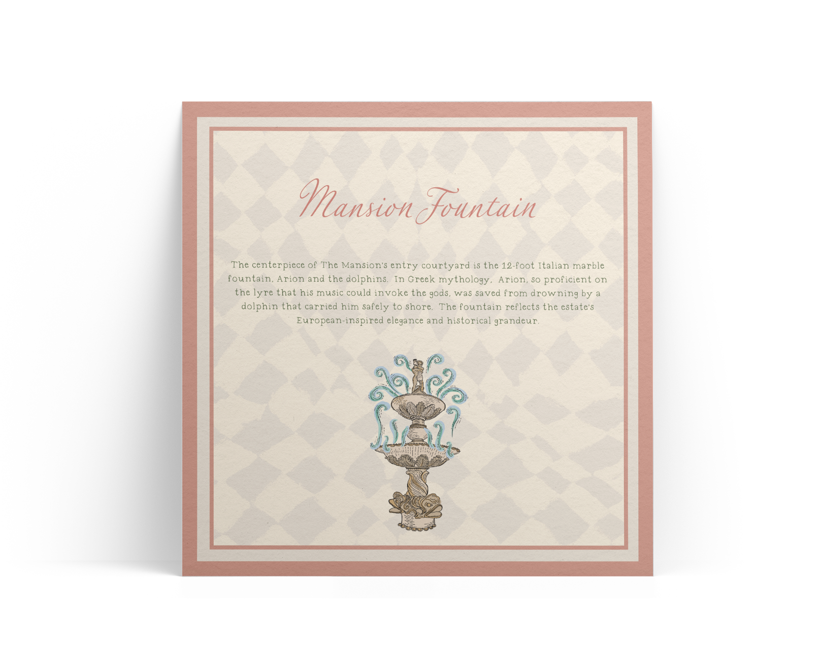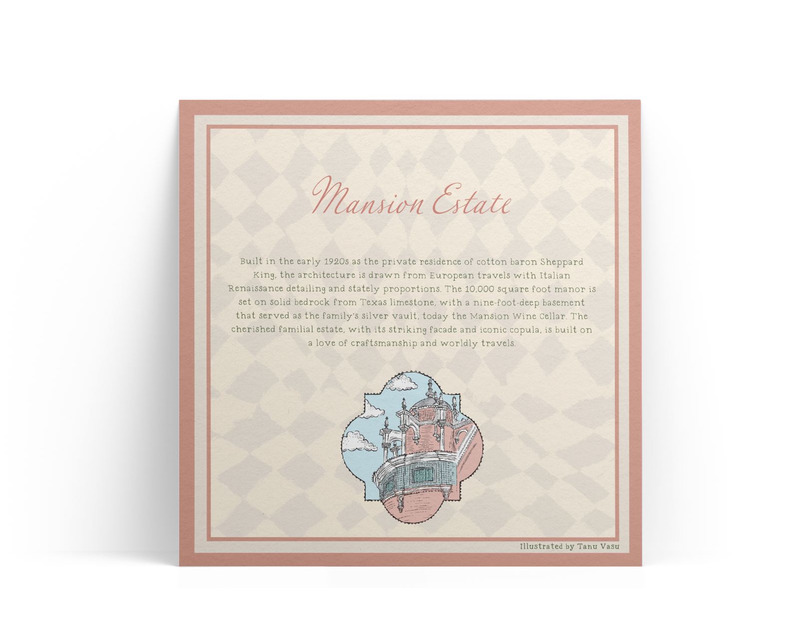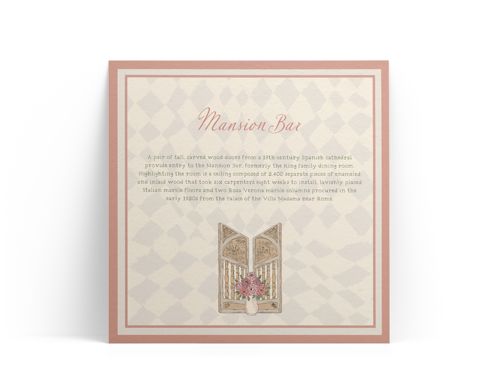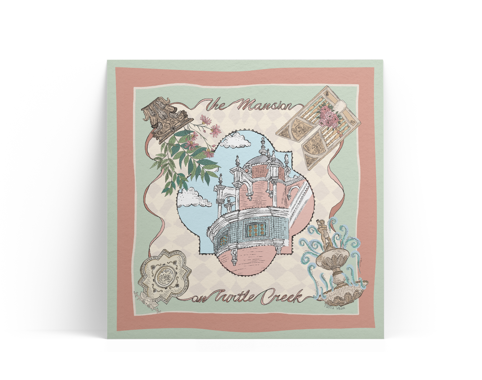 Created for Rosewood Mansion on Turtle Creek, this illustrated card set highlights the most storied spaces of the iconic Dallas estate. Each card features a hand-drawn rendering of the Mansion’s architectural details from the marble fountain at the entrance to the ornate library and historic bar doors capturing the property’s European influences and timeless Texan charm. Soft pastels, delicate linework, and subtle patterns echo the Mansion’s gentle sophistication.